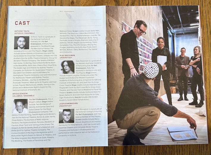 The immediate symbolism – freedom for Palestine – is supplemented by a context-specific statement. In November 2023, Sydney Theatre Company publicly apologised after three actors wore keffiyehs at the opening night curtain call of The Seagull. I don’t think I’m alone in concluding that Shammas appears as he does in the programme to remind Australian theatre-goers that the keffiyeh is not going anywhere.